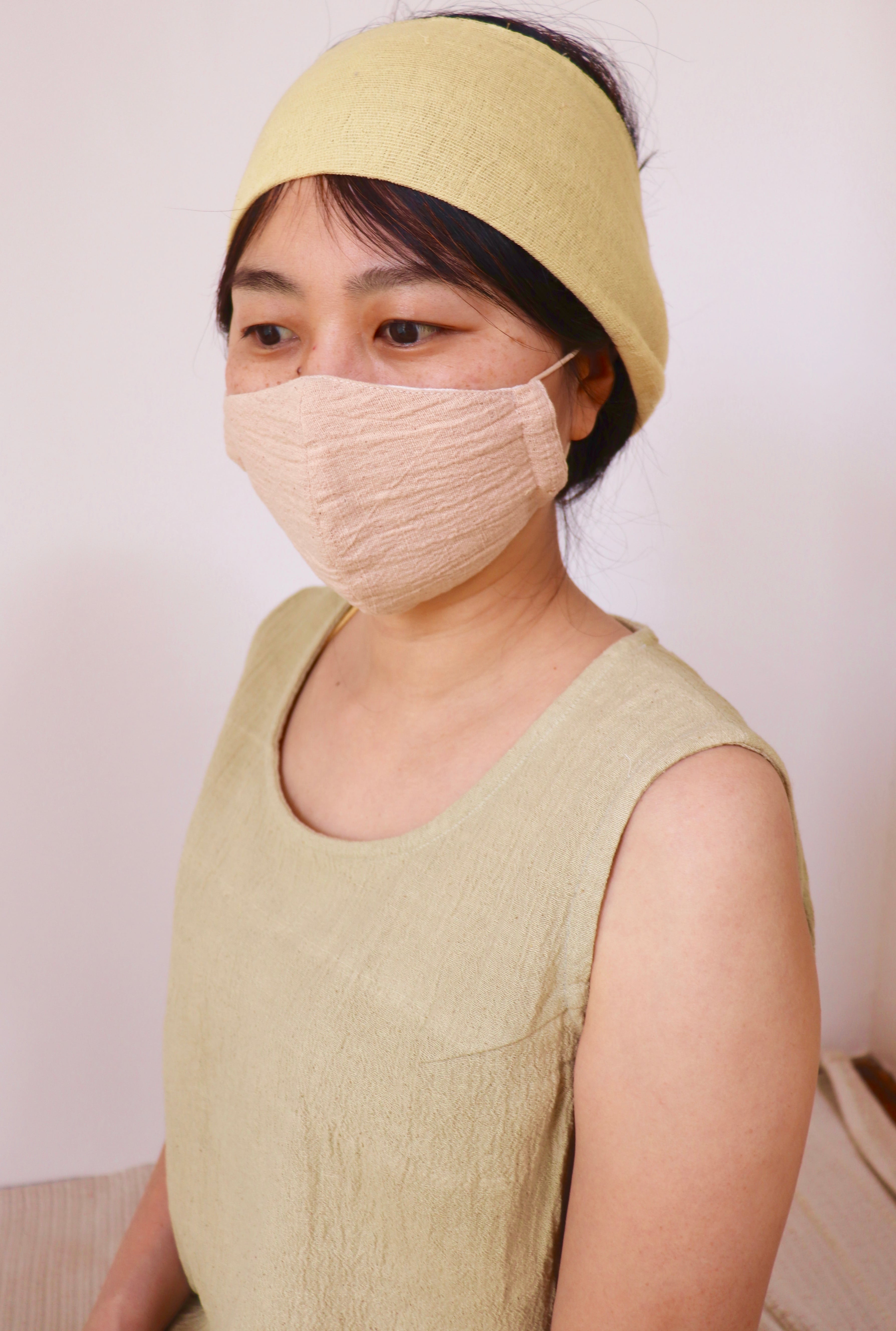 ②ターメリック・イエロー:数種類のターメリック、サンダルウッド、アロエベラ、ニーム、トゥルシーなど50種類の薬草を使用。ターメリック染めは体を温める作用があります。生地の質感も柔らかく肌の弱い方にもおすすめ。